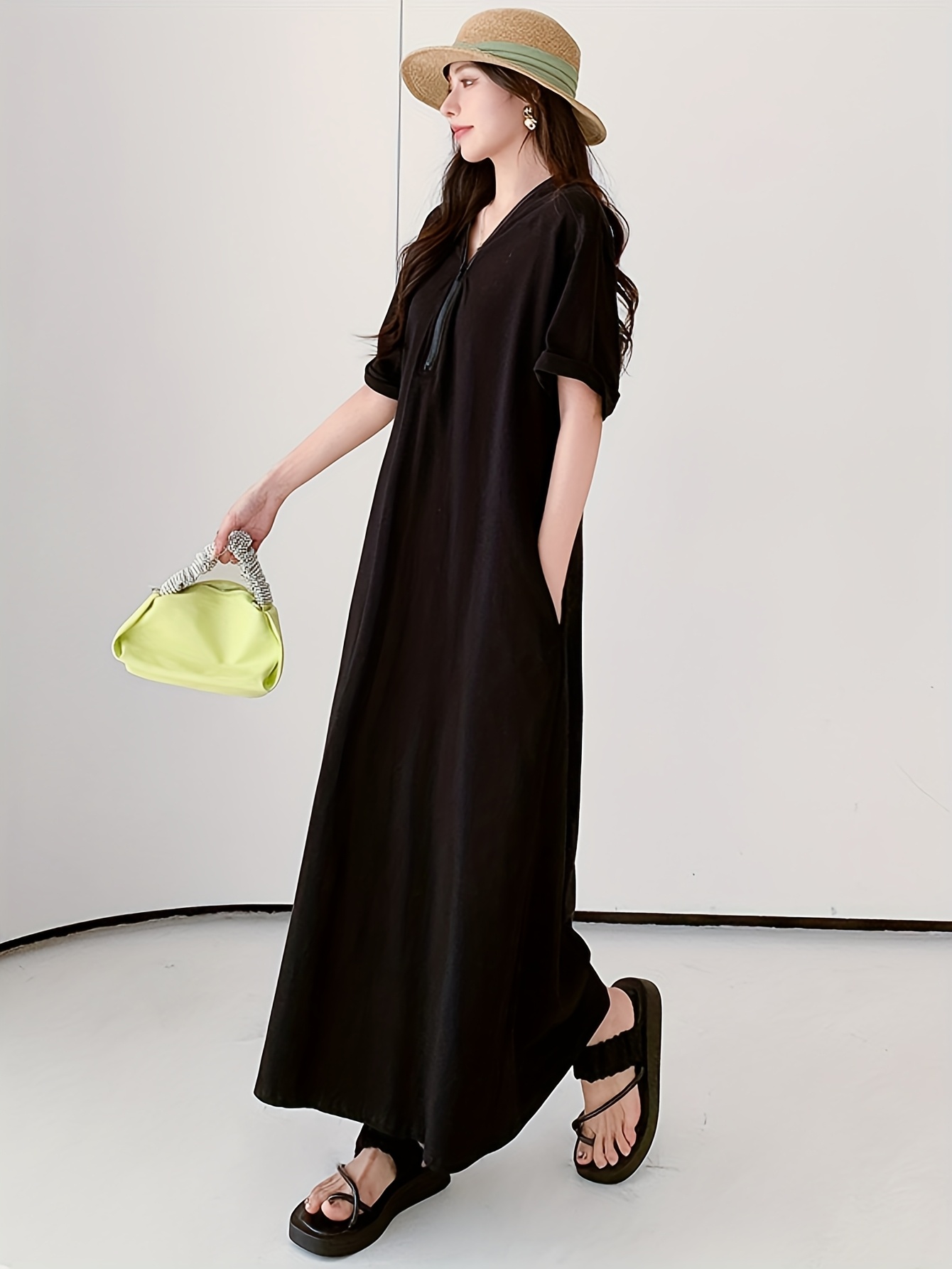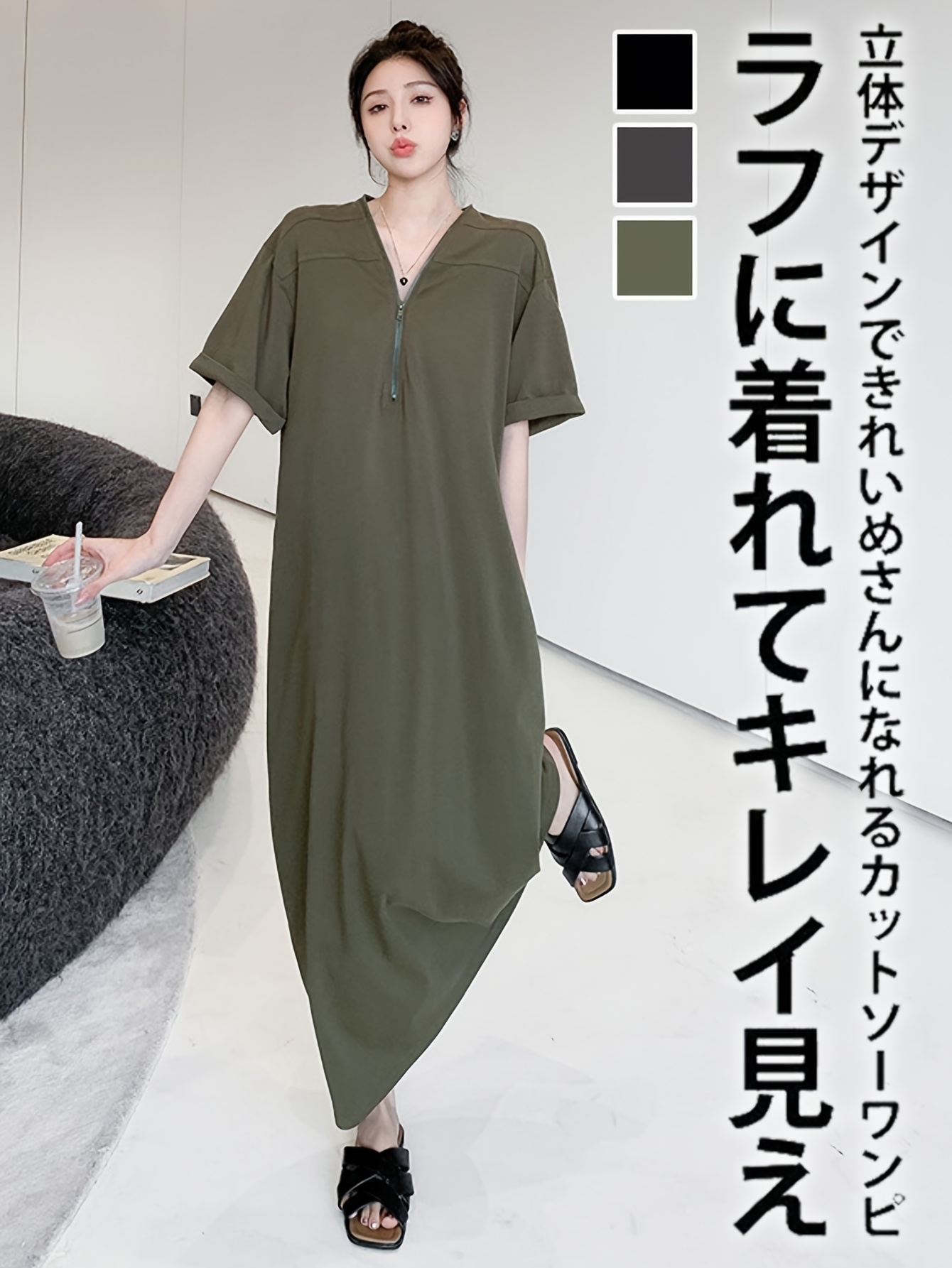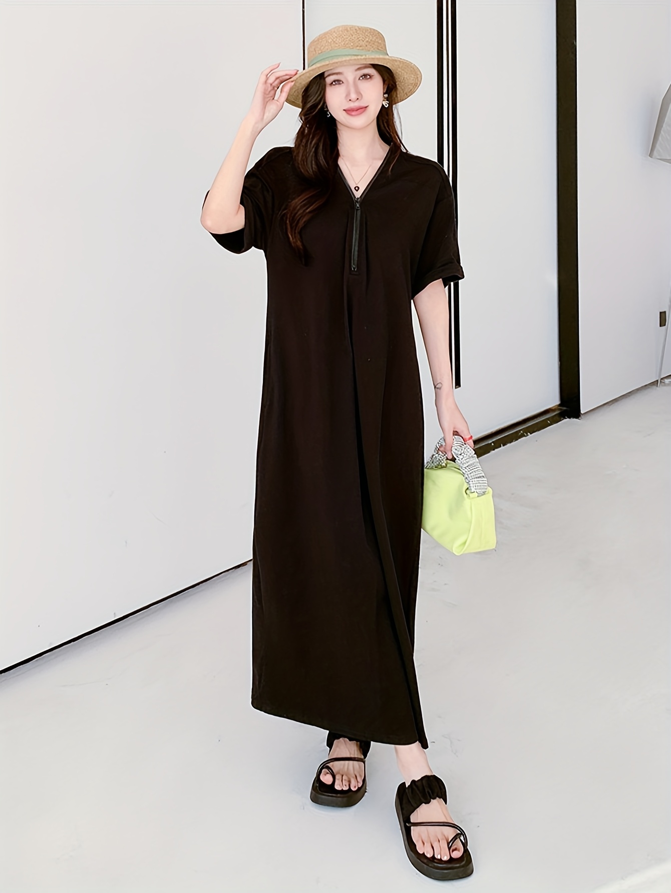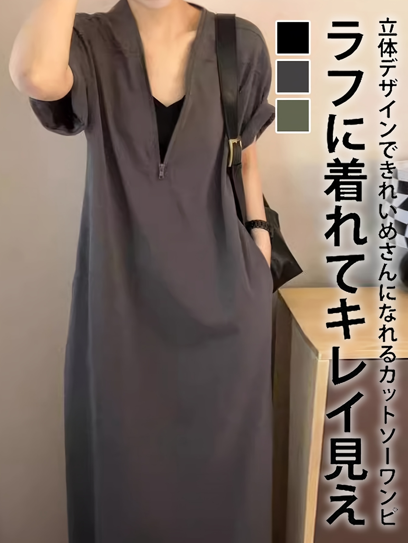【5天内发送】 レディース ワンピース おしゃれ ハーフジップ ワンピ 半袖 大きいサイズ 夏 フレンチ袖 ゆったり 体型カバー マキシ丈 Vネック 夏服 ロング丈 シンプル ロングワンピース 着痩せ 通勤 黒 上品 綿 大人カジュアル 旅行 ロング ZP-111