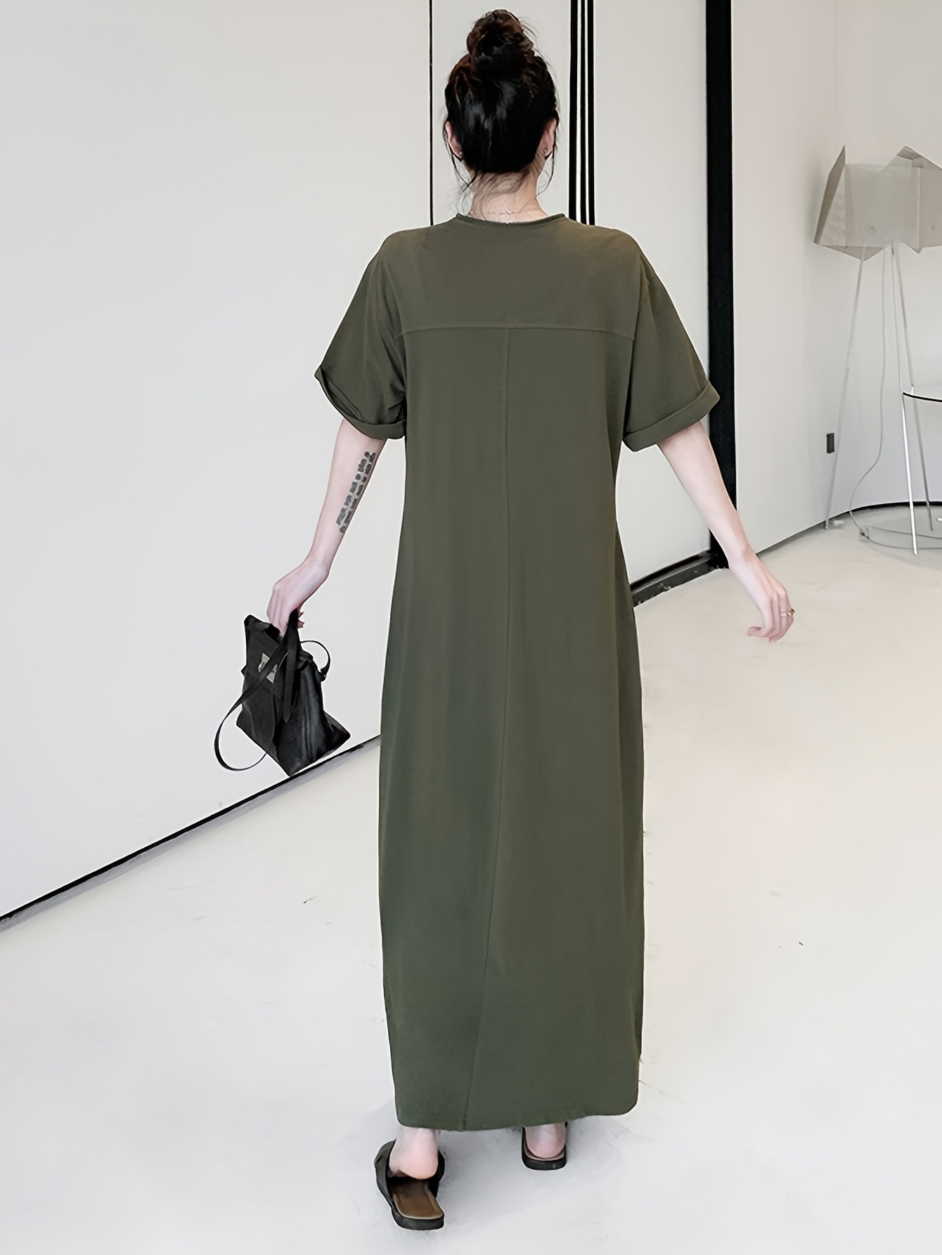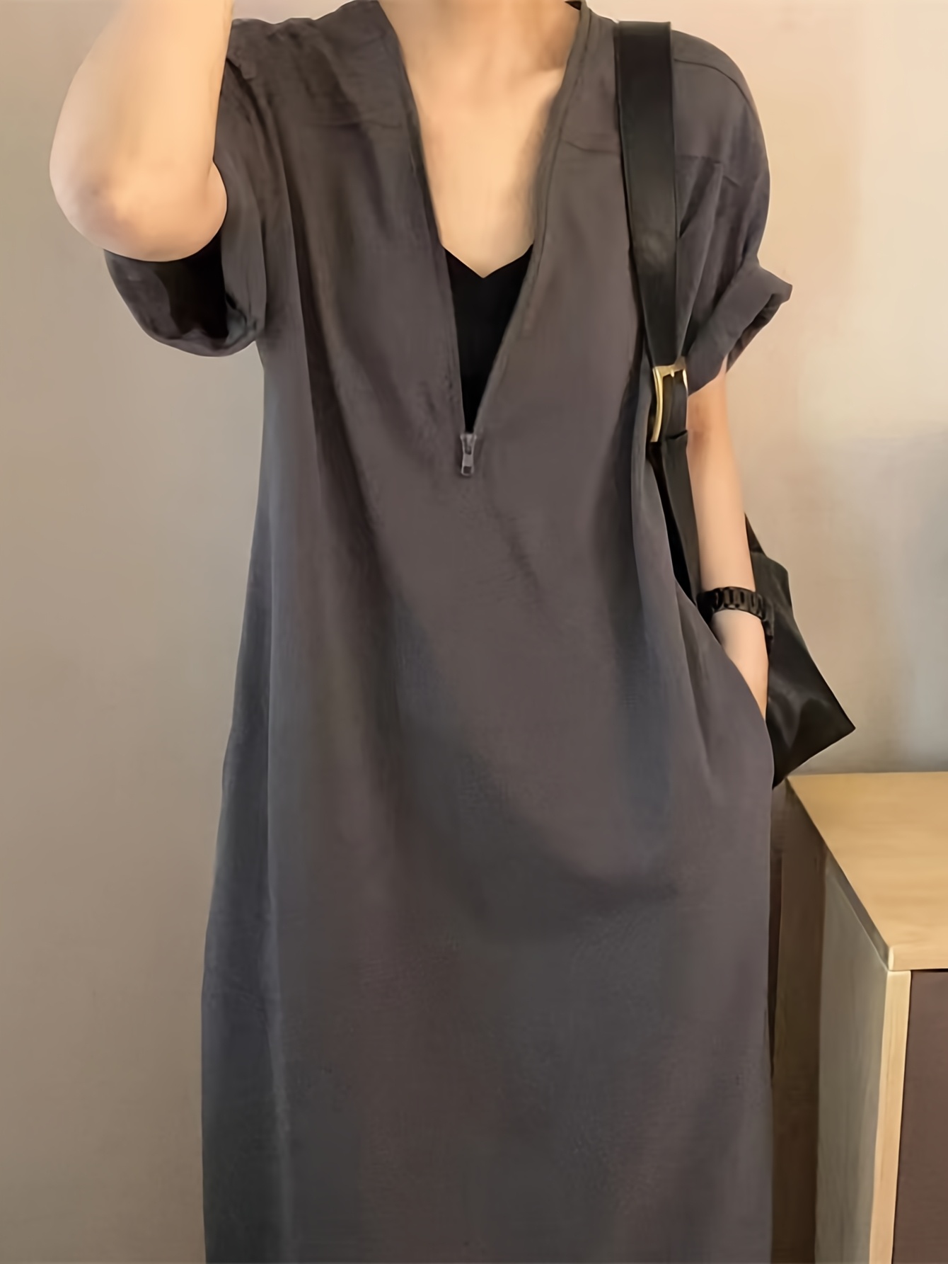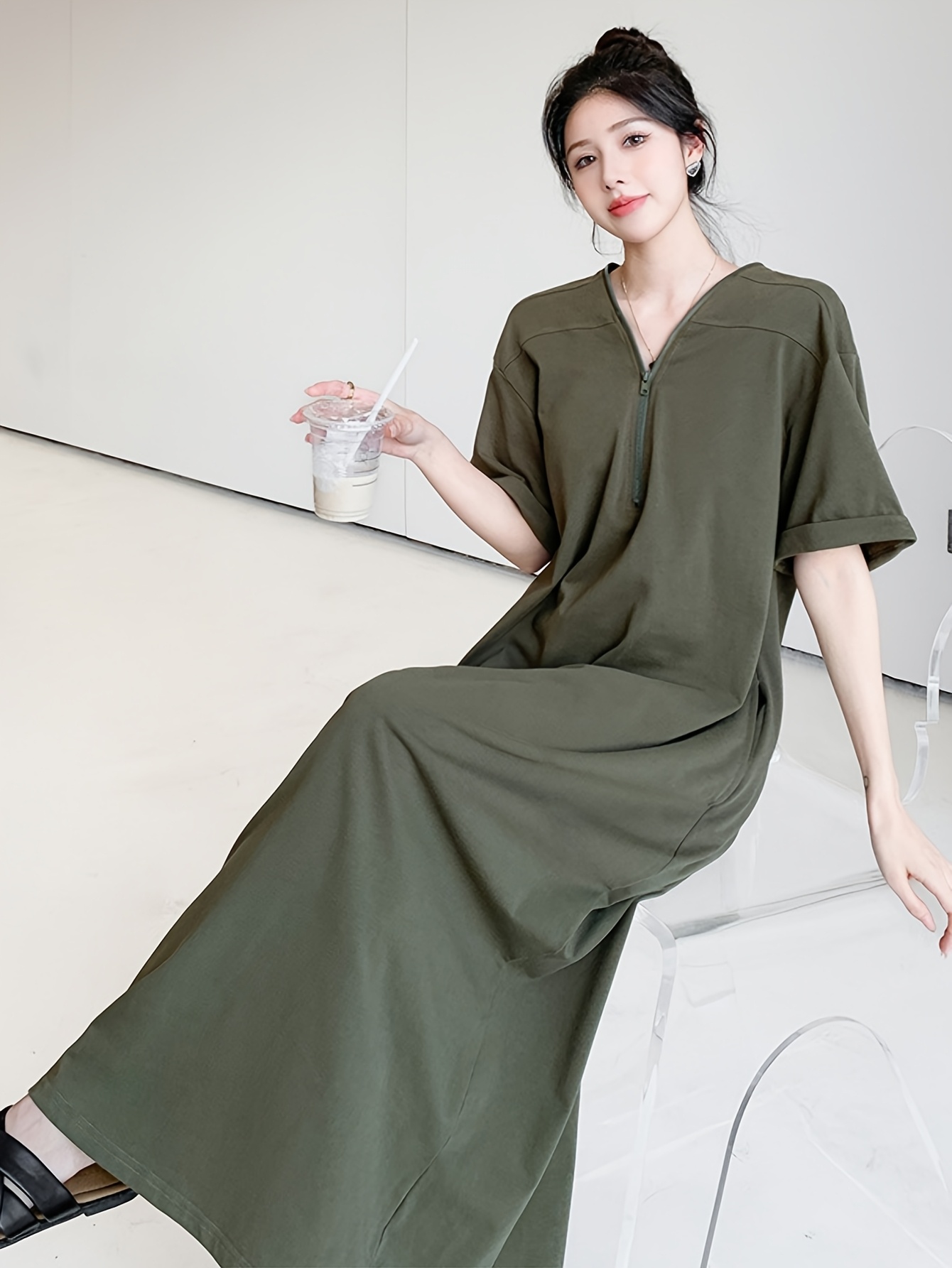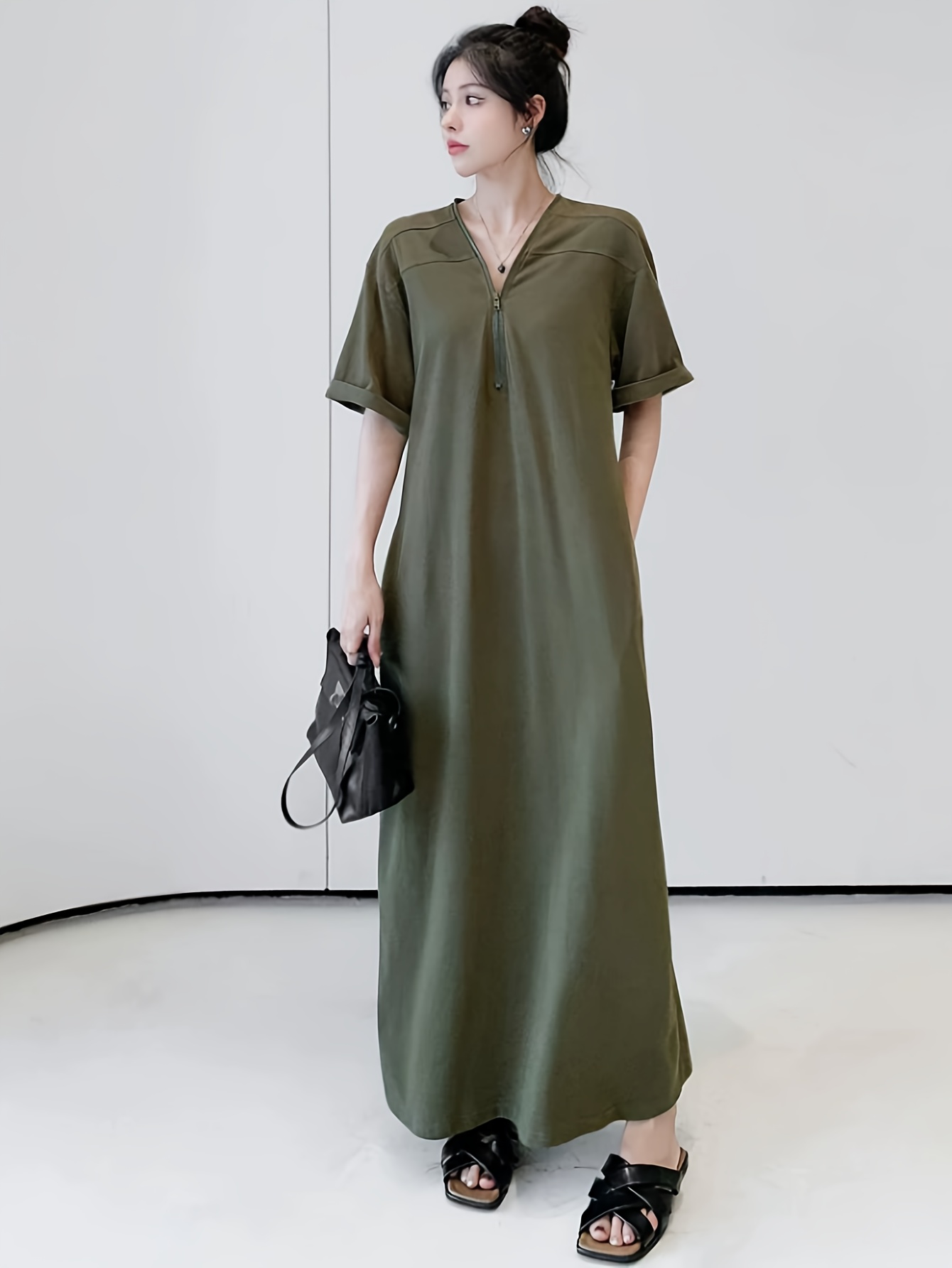 【5天内发送】 レディース ワンピース おしゃれ ハーフジップ ワンピ 半袖 大きいサイズ 夏 フレンチ袖 ゆったり 体型カバー マキシ丈 Vネック 夏服 ロング丈 シンプル ロングワンピース 着痩せ 通勤 黒 上品 綿 大人カジュアル 旅行 ロング ZP-111